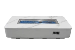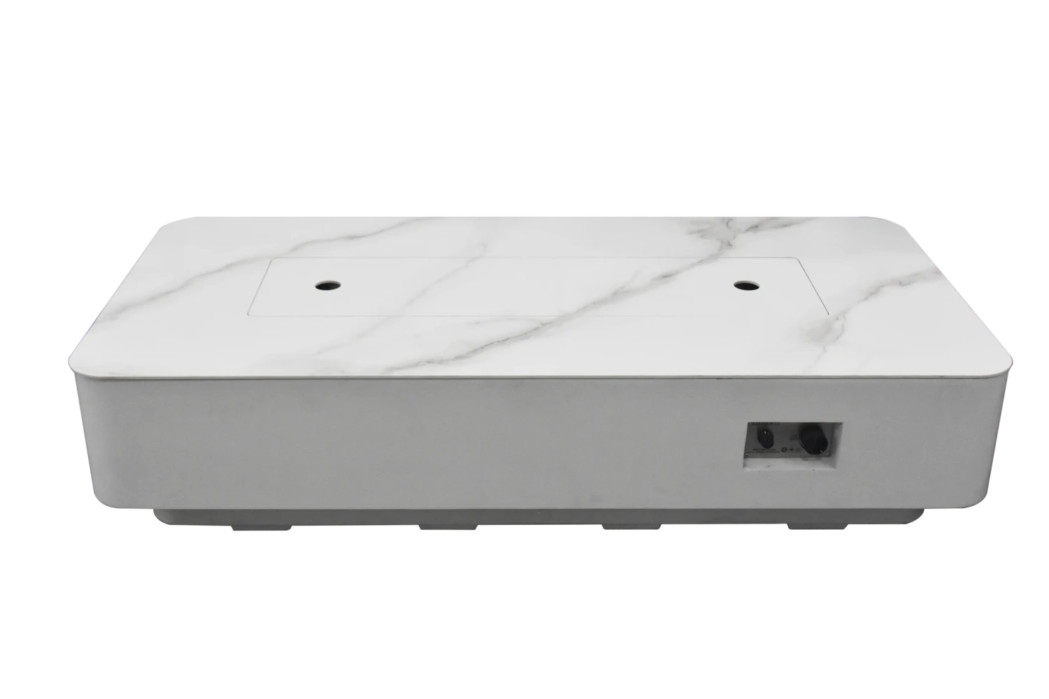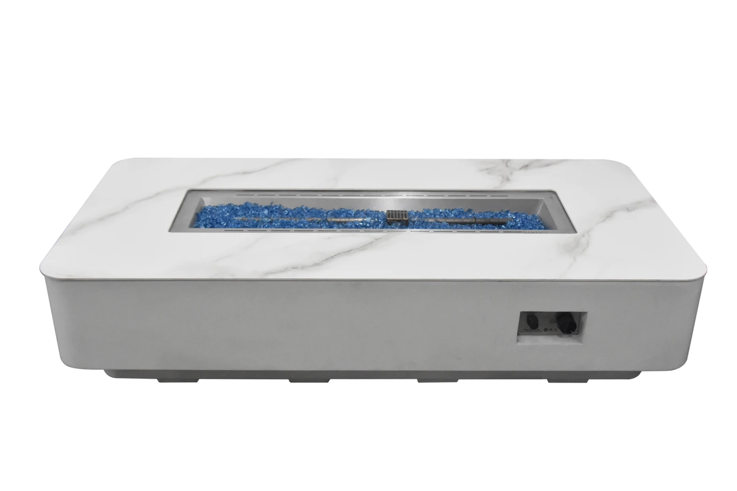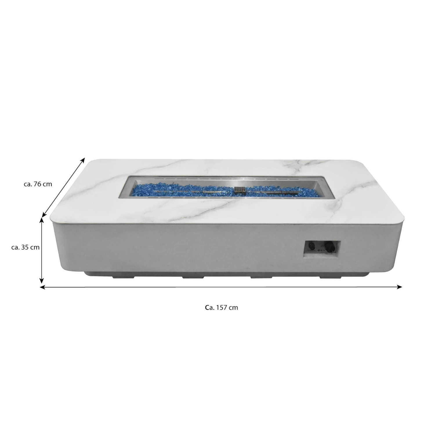 Die rechteckige Luxus Gas Feuerstelle Athen Marmor-Optik weiß wurde elegant mit abgerundeten Ecken designet. Die Oberfläche der Tischplatte ist glattpoliert und in einer Marmor-Optik gestaltet, die dem Gaskamin einen edlen Charakterzug verleiht. In der Mitte der Feuerstelle befindet sich ein Brenner mit besonders hohen Heizleistung. Das darauf platzierte Deko-Glassplitt sorgt für eine außergewöhnliche Ausstrahlung des Feuers. Wenn die Feuerstelle nicht im Einsatz ist, lässt sich der Brenner mit dem mitgelieferten Keramik-Deckel perfekt abdecken und sie kann einfach als ein Tisch benutzt werden. Maße: ca. L 158 x B 76 x H 36 cm