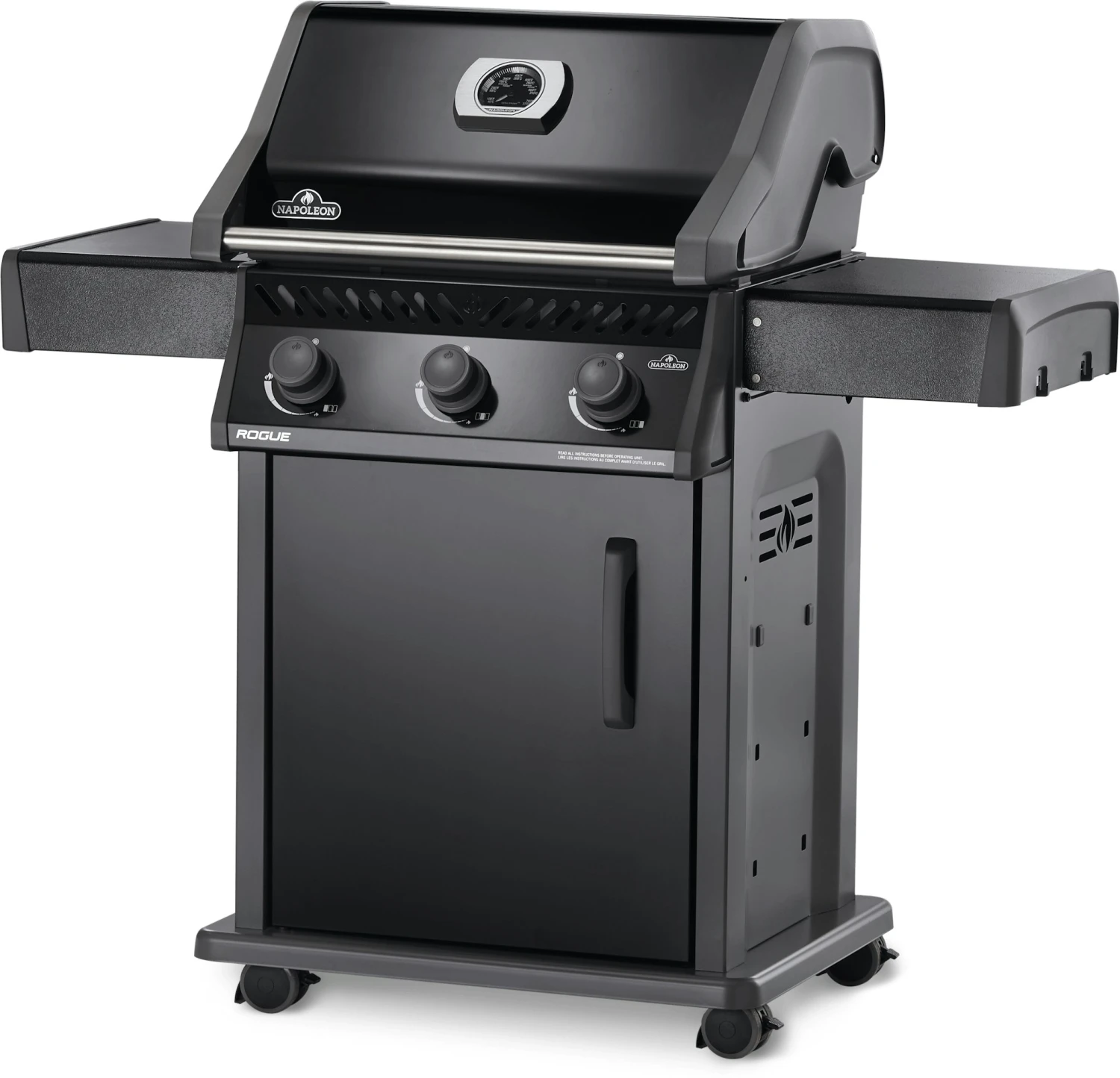 Wenn perfekte Grillstreifen eine Frage der Ehre sind, dann ist der Propangasgrill Rogue® 425 von Napoleon in Schwarz genau der richtige Grill für Sie. Dank einer Konstruktion, durch die sich der Montageaufwand halbiert, kommen Sie noch schneller zum Grillen. Der elegante, porzellanemaillierte schwarze Deckel und die Tür des integrierten Stauraums fügen sich nahtlos in die Umgebung Ihres Gartens. Dank fixierbarer Lenkrollen können Sie den Rogue® mühelos mitten ins Geschehen schieben. Durch die klappbaren Seitenablagen aus Edelstahl lässt sich dieser Grill noch kompakter im Bereich hinter Ihrem Haus unterbringen. Seien Sie anders, grillen Sie anders. Zeit für den Rogue®. Zaubern Sie mit 2.742 cm² Hauptgrillfläche fantastische Gerichte für sich selbst oder eine Gruppe von Gästen. Sie erkennen unsere ikonischen Napoleon WAVE™ Grillroste an den charakteristischen Grillstreifen. Die drei Brenner aus Edelstahl liefern 10,55 kW Hitze haargenau dort, wo sie gebraucht wird. Zweistufige Flammschutzeinsätze aus Edelstahl lassen tropfendes Fett verdampfen und sorgen beim Grillen für ein intensives Aroma. Ihre Freunde und Angehörigen werden Sie als kulinarisches Genie feiern. Grillfläche: 60 x 45 cm
